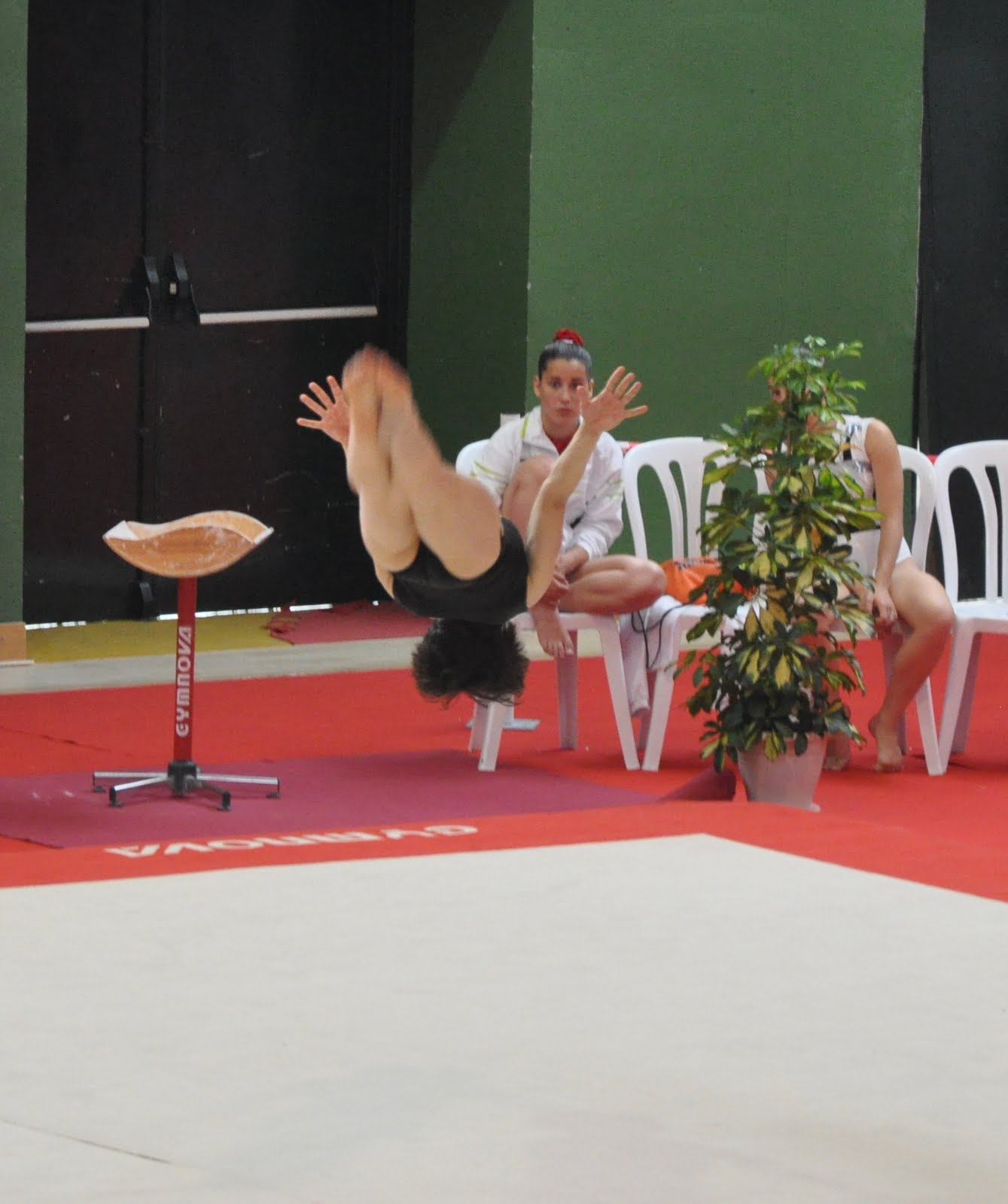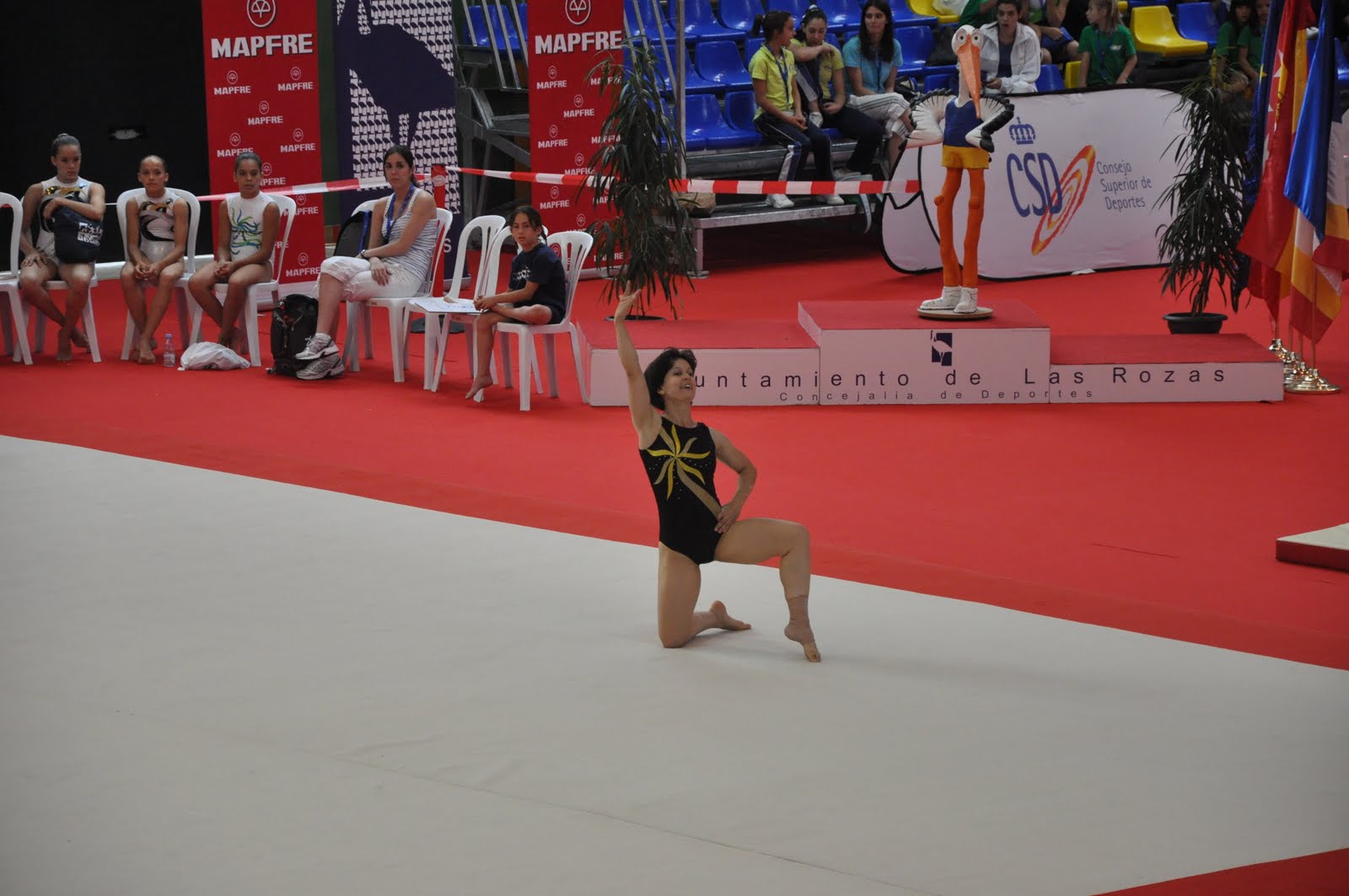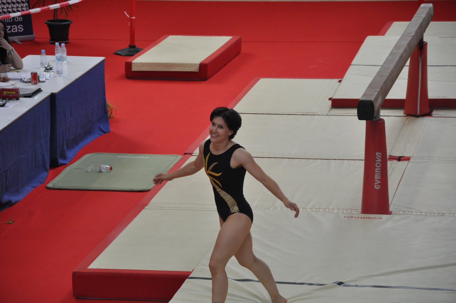 Sospechaba que la coreografía iba a gustar, ya me lo habían comentado varias personas, pero en el calentamiento previo a la competición se me fue la olla y no me salía NADA. Casi me descalabro el cuello un par de veces y todo. Además me había torcido un tobillo el lunes y aunque no me dolía mucho (gracias, FISA, y gracias, servicios de fisioterapia de la competición 😉 ) iba algo insegura. Por otra parte, acababa de perpetrar un bodrio de ejercicio de barra 🙁 y no tenía yo muy claro qué iba a salir del suelo.